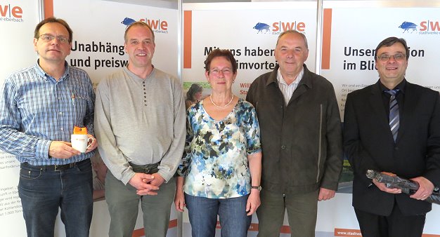 Bei der Bauausstellung gab es Freibadkarten und Ökostrom zu gewinnen Günter Haag (r.) und Michael Sigmund (l.) mit den Ökostrom-Gewinnern Michael Schibl, Rita Flachs und Gerhard Siefert (v.l.) . (Foto: Claudia Richter)(cr) Bei der Bauausstellung der Sparkasse Neckartal-Odenwald im März in Eberbach (wir berichteten), konnten die Besucher an einem Gewinnspiel der Stadtwerke Eberbach teilnehmen. Gestern wurden die Preise an die Gewinner überreicht.