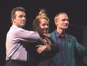 Kabarett-Profis gastierten in ausverkaufter Stadthalle Marco Schiedt, Ute Loeck und Roland Kurzweg (v.l.) nahmen den Zustand der Republik aufs Korn. (Foto:Richter)(hr) Eines der ältesten und bekanntesten deutschen Kabarett-Ensembles gastierte gestern abend in der Eberbacher Stadthalle: die Leipziger "Pfeffermühle". Die Organisatoren vom Kulturamt hatten sich Mühe gegeben, mit liebevoll dekorierten Vierer-Tischen etwas Kleinkunst-Atmosphäre in den für solche Gelegenheiten eher überdimensionierten Großen Saal zu zaubern. Das ging natürlich auf Kosten der Kapazität, denn die gut 350 Sitzplätze waren bereits seit Tagen ausverkauft.