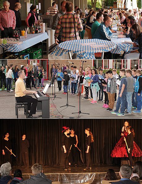 Das Wetter war besser als erwartet und so konnten die zahlreichen Gäste ihre Weißwürste und weitere Spezialitäten im Freien verzehren. Dazu gab es Gesang von Chören und Klassengemeinschaften, der vom deutschen Liedgut bis hin zu Pop und englischen Gospels reichte, teils mit eigener Bandbegleitung. Kaffee und Kuchen gab es in der Mensa, und im Mensabereich waren Schülerwerke der Klassen 5-12 der Fachschaft Bildende Kunst ausgestellt. Auf einen interessanten Theaterabend am 26. oder 27. Juni können sich die Fans der Theater-AG des HSG heute schon freuen. In der Aula gaben die Schauspielerinnen eine vielversprechende Kostprobe des neuen Stückes "Cyrano de Bergerac".