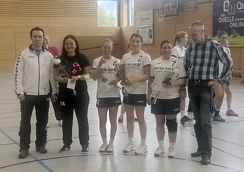 Gestecktes Saisonziel wurde erreicht Vor dem Spiel wurden langjährige Spielerinnen verabschiedet, die zum Ende der Runde ihr Karriereende bekannt gaben. Die Damen mit dem Damentrainer und 1. Vorsitzenden der SGH (v. l.):
