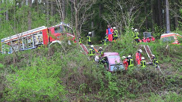 Die Eberbacher Feuerwehr (Abteilungen Stadt und Friedrichsdorf) sicherte zunächst die labile Situation des Fahrzeugs. In einer aufwändigen Aktion mussten der 47-jährige Fahrer und seine Beifahrerin im Steilhang aus dem Pkw gerettet werden. Nachdem die beiden Verletzten vom Rettungsdienst erstversorgt worden waren, befreiten die Feuerwehrleute sie aus dem Fahrzeug und brachten sie in Rettungswannen nach oben auf die Straße zur weiteren Versorgung durch das Notarztteam und das DRK.