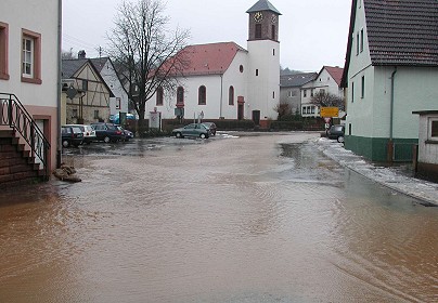 Land unter in Schönbrunn (Foto:GVS)(hr) Aufgrund der starken Niederschläge hieß es heute auf vielen Straßen in allen Ortsteilen Schönbrunns "Land unter". Unser Bild zeigt die Ortsmitte von Schwanheim kurz nach 12 Uhr. Die enormen Wassermassen konnten teilweise von der Kanalisation nicht mehr gefasst werden. Obwohl die Arbeiter des kommunalen Bauhofes, Feuerwehrangehörige und viele Mitbürger freiwillig mit der Reinigung der Einlaufbauwerke beschäftigt waren, strömte das Wasser überall dort, wo die Kanäle bis an der Rand gefüllt waren, auf den Ortsstraßen durch die Dörfer.