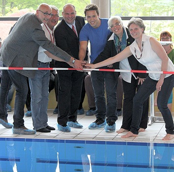 Schwimmen lernt man nur, wenn man ins Wasser geht So gemeinsam, wie sie an der Umsetzung des neuen Lehrschwimmbades an der Oberzentschule in Beerfelden gearbeitet hatten, so einträchtig durchtrennten sie auch das Band bei der offiziellen Einweihung. V.l.: Werner Belzer, Technischer Leiter des Eigenbetriebs Bau- und Immobilienmanagement (Bimo) des Odenwaldkreises, Klaus Meier, Projektverantwortlicher beim Bimo, Ersten Kreisbeigeordneten Oliver Grobeis, Schulsprecher Janis Ihrig, Schulleiterin Bernhild Hofherr und Architektin Gesine Stöcker. (Foto: privat) (bro) (owk/sh) „Schwimmen lernt man nur, wenn man ins Wasser geht“, mit diesen Worten begrüßte kürzlich Schulleiterin Bernhild Hofherr die zahlreichen Gäste anlässlich der offiziellen Einweihung des neuen Lehrschwimmbades an der Oberzentschule in Beerfelden. „Dank des Einsatzes von Schülern, Eltern Politikern und ausführenden Handwerkern ist das hier bei uns nun wieder möglich, dafür möchten wir allen Beteiligten danken“, sagte Hofherr.