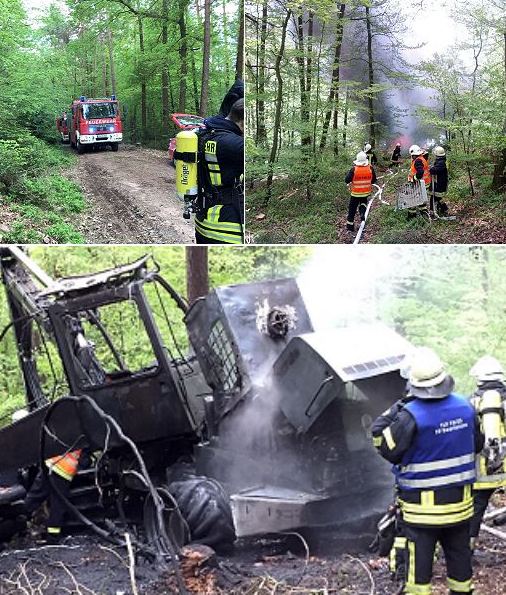 Holzvollernter stand in Flammen (Fotos: privat)(bro) (uw) Gestern wurde die Freiwillige Feuerwehr Sensbachtal wegen eines Harvester-Brandes im Sauersgrund, Sensbachtal, alarmiert.