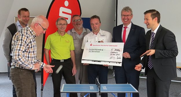 An der Tischtennisplatte 700 Euro erspielt (Foto: Claudia Richter)(cr) Ein Tischtennisturnier an einer Mini-Tischtennisplatte während der Bauausstellung der Sparkasse Neckartal-Odenwald im vergangenen März (wir berichteten) verhalf dem Paulusheim in Eberbach jetzt zu einer Geldspende von 700 Euro. Aussteller und Sparkasse übergaben dieses Geld für die Jugendhilfe.