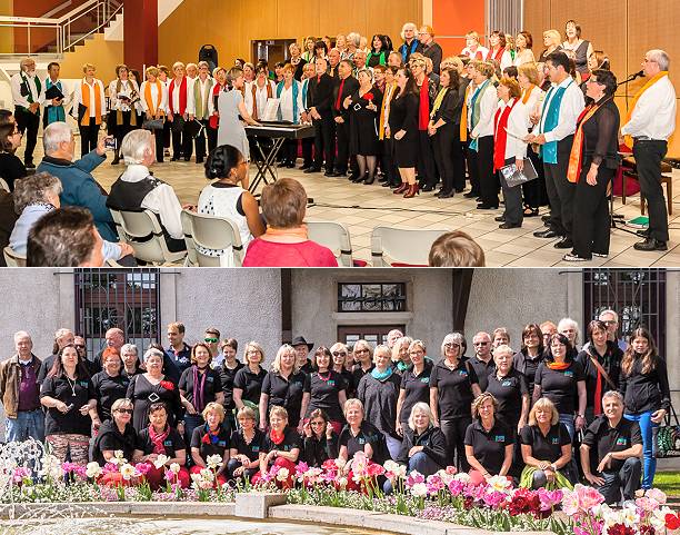 Begegnung macht Lust auf mehr Oben: Die befreundeten Chöre "Right Now!" und "La Mi Choeur" vereint beim gemeinsamen Liedvortrag.Unten: Der Chor von "Blumen umrahmt". (Fotos: Andreas Held).