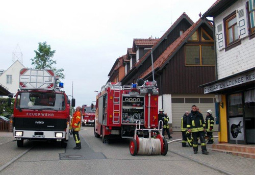 Drehleiter aus Eberbach angefordert Da man zunächst von einem Dachstuhlbrand ausging, war aus Eberbach eine Drehleiter angefordert worden. (Foto: FFW Waldbrunn)(hof) Gestern Abend wurde die Feuerwehr Strümpfelbrunn gegen 18 Uhr zu einem gemeldeten Dachstuhlbrand in eine Strümpfelbrunner Gaststätte gerufen.
