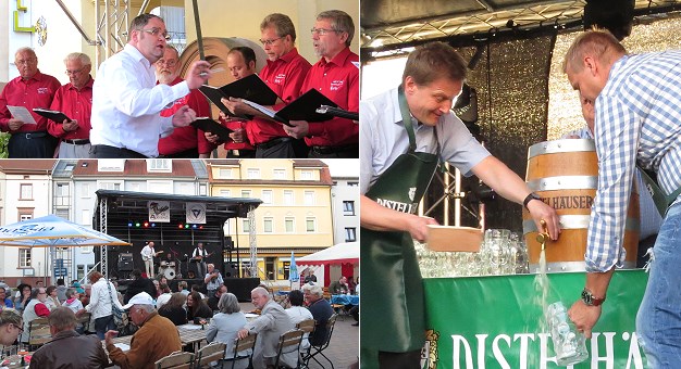 In der Innenstadt wird wieder drei Tage lang gefeiert (Fotos: Claudia Richter/ Hubert Richter)(hr) In Eberbach hat gestern Abend mit dem traditionellen Frühlingsliedersingen und einem Fassanstich bei idealem Wetter das 36. Frühlingsfest begonnen.