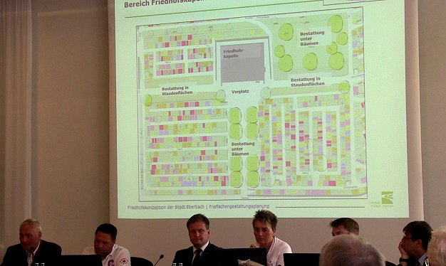 SPD-Stadtrat Klaus Eiermann wünschte darüber hinaus die Prüfung, ob auf Eberbacher Gemarkung eine Art “Friedwald” ausgewiesen werden kann. Bürgermeister Peter Reichert äußerte Bedenken, ob eine solche Einrichtung wirtschaftlich betrieben werden könnte, da es bereits einige “Friedwälder” bzw. “Ruhehaine” in der Umgebung gebe und diese einen großen Einzugsbereich hätten.