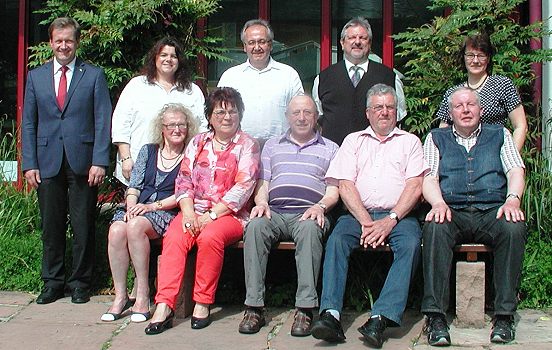 25-jährige Dienstjubiläen und Verabschiedungen in den Ruhestand Bürgermeister Peter Reichert, Nicole Rupp, Manfred Schüßler, Klemens Bernecker, Luzia Scharf (v.l., obere Reihe, stehend), Monika Wilkner, Monika Geuder, Peter Schell, Wolfgang Scheuermann, Günter Wien (v.l. untere Reihe, sitzend). (Foto: privat)(bro) (stve) Ins „Restaurant am Leopoldsplatz“ hatte dieser Tage Bürgermeister Peter Reichert eingeladen, um mehrere Dienstjubiläen zu begehen und drei langjährige Mitarbeiter im Kreis ihrer Ehepartner und der jeweiligen Dienstvorgesetzten in den Ruhestand zu verabschieden.