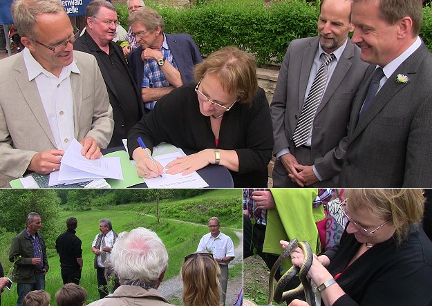 Regierungspräsidentin Kressl unterzeichnete die Schutzgebietsverordnung Oben die feierliche Unterzeichnung der Verordnung durch Regierungspräsidentin Kressl im Beisein von Dr. Christoph Aly, Joachim Bauer vom Landratsamt und Bürgermeister Peter Reichert (v.l.). Unten: Kurzexkursion ins Schutzgebiet und Begegnung der Regierungspräsidentin mit einer lebenden Äskulapnatter. (Fotos: Hubert Richter)(hr) Seit Donnerstag ist ein rund 19 Hektar großer Talbereich unterhalb des Eberbacher Ortsteils Brombach offiziell als Naturschutzgebiet ausgewiesen.