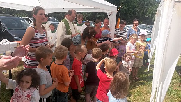 Nach der gemeinsamen Feldmesse, unter Mitwirkung der katholischen Pfarrkapelle und der Kinderkirche, hatten die Mitglieder der Kolpingsfamilie alle Hände voll zu tun. Es wurde Erbseneintopf, Bratwurst sowie Kaffee und Kuchen angeboten. Die Kinder nutzten das weitläufige Gelände zum Spielen. Für Abkühlung sorgte die vorbeifließende Itter.