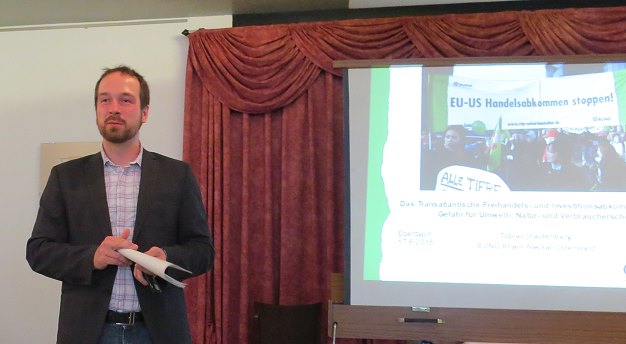 Handelsabkommen mit weitreichenden Folgen Tobias Staufenberg bei seinem Vortrag. (Foto: Claudia Richter)(cr) Zu einer Info-Veranstaltung über das "Transatlantische Freihandelsabkommen", kurz TTIP, lud am Mittwoch das Unternehmerinnen-Forum Eberbach und Umgebung (UFO) ein. Referent war Tobias Staufenberg, Regionalgeschäftsführer beim BUND Regionalverband Rhein-Neckar-Odenwald.