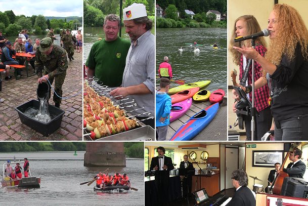 Am Neckarlauer in Eberbach veranstaltete die Reservistenkameradschaft mit Unterstützung durch DLRG und THW wieder ein Schlauchbootrennen. Das schnellste Team stellten in diesem Jahr die englischen Soldaten der “Royal Engineers”, die zurzeit wieder für ein Workcamp in Eberbach gastieren. Zweiter wurde das Schlauchbootteam des DRK, gefolgt von der SG Rockenau auf Platz 3. Zusätzlich zum Wettrennen auf dem Fluss maßen sich die Mannschaften noch im Wasserschöpfen aus dem Neckar. Für musikalische Unterhaltung sorgte die Feuerwehrkapelle Waldkatzenbach. Weitere Aktionen in Eberbach gab es beim Kanuclub, im Heilkräutergarten sowie im Interkulturellen Garten. Am Abend konnte man im Fahrgastschiff “Petra Kappes” bei einer Neckar-Rundfahrt ein Jazzkonzert mit “Wilhelm Wolf und die möblierten Herren” genießen (Bild r.u.).