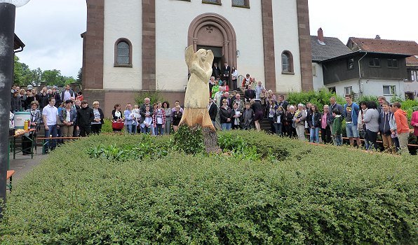 Ein Engel wacht nun vor der Kirche  Der Engel aus Holz von Hubert Göhrig nach seiner Enthüllung auf dem Platz vor der evangelischen Kirche in Schönbrunn. (Foto: privat)(bro) (maw) Eine Engelskulptur aus Holz ziert seit Kurzem den Vorplatz der evangelischen Kirche in Schönbrunn. Der Engel wurde vom Schönbrunner Hubert Göhrig nach eigenem Entwurf mit der Kettensäge gefertigt und nun im Rahmen eines Gottesdienstes enthüllt.