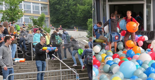 Feucht-fröhliche Party am und im HSG (Fotos: Claudia Richter)(cr) Ausnahmezustand herrschte heute am Eberbacher Hohenstaufen-Gymnasium. Die Abiturienten begrüßten ihre Mitschülerinnen und Mitschüler vor der ersten Unterrichtsstunde mit viel Getöse und gefüllten Wasserspritzpistolen. Und auch das Betreten des Gebäudes war beschwerlich. Schulleiter Helmut Schultz nahm die heutige Aktion gelassen.