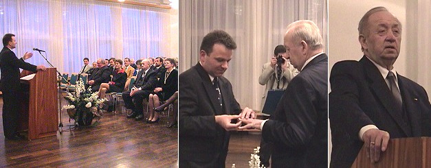 Bürgermeister Bernhard Martin zitierte in seiner Laudatio die dem Geehrten zugeschriebenen Eigenschaften wie Aufrichtigkeit, Verlässlichkeit, Einsatzfreude, Zähigkeit und Klugheit. Das Stadtoberhaupt resümierte: "Er ist ein Vorbild, ein Politiker vom alten Schlag". Außerordentlich viel geholfen habe Weiser der Stadt Eberbach. Seine Unterstützung sei bei Projekten wie der Umgehungsstraße L 2311, der Bahnunterführung Lindach, Abwasserbeseitigungsmaßnahmen, Erhalt des Schlachthofs oder ganz allgemein bei der Beschaffung von Zuschüssen unerlässlich gewesen. "Ohne den langjährigen Einsatz Dr. Weisers stünde Eberbach nicht da, wo wir heute stehen", ist sich Martin sicher. Und ein gerüttelt Maß an persönlichem Dank schwang mit, als Martin seinem ehemaligen Chef und "politischen Lehrmeister" den Ring an den Finger steckte. Bernhard Martin war vor seiner Bewerbung um den Bürgermeister-Posten in Eberbach von 1993 bis 1996 persönlicher Referent Weisers im Ministerium für den ländlichen Raum.