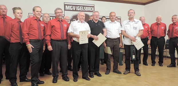 Geehrt wurden im Anschluss für 25 Jahre Vereinszugehörigkeit Bernd Gerstmeier und Dirk Gugau, für 40 Jahre Waltraud Muff, Wolfgang Fink, Karl-Heinz Riedling und Dieter Kräher, für 50 Jahre Erhard Beisel und Kurt Beisel sowie für 60 Jahre Roland Michel. Als kleines Dankeschön bekam jeder eine Flasche Wein und natürlich auch eine Urkunde. Rainer Bruche, beim MGV Igelsbach Mitglied seit 1984, feierte vor kurzem seinen 75. Geburtstag. Er wurde zum Ehrenmitglied ernannt und bekam eine Ehrenurkunde überreicht.