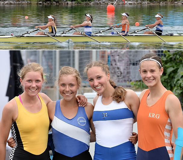 Siegerehrung v.l.: Kristina Engelke (München), Lena Olbrich (Erlangen), Laura Link und Mia Müller (Kettwig). (Fotos: privat)(bro) (tg) Die Deutschen Junioren Meisterschaften im Rudern fanden am vergangenen Wochenende auf dem Fühlinger See im Norden von Köln statt. Die Rudergesellschaft Eberbach war bei diesen nationalen Titelkämpfen mit vier Ruderinnen und einem Trainer vertreten.