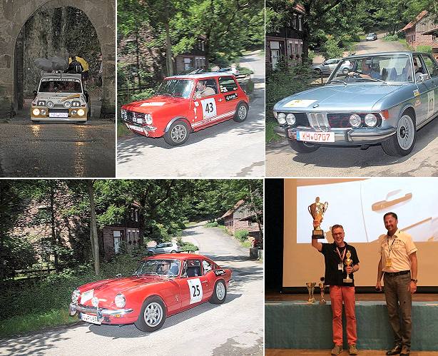 Nach dem gemeinsamen Abendessen folgte die Siegerehrung im Kurhaus. Auf den ersten Platz kam das Team Knuth und Markus Henneke aus Neustadt und Ingolstadt mit ihrem Triumph GT 6 MK II. Nach 15 Zielzeiten hatten sie eine Abweichung von 1,52 Sekunden. Der zweite Platz ging nach Tschechien: Milos Kaspar und Marie Janek aus Rockycany auf Austin Mini 1275 GT (1,67 sec). Den dritten Platz erkämpften sich Patrick Weber und Sonja Ackermann aus Bad Kreuznach auf einem rechtsgelenkten BMW 3,0 si. Platz vier ging an Gotthard Schleicher und Maria Schmitt aus Ebern, Porsche 924 (2,49 sec) und Platz fünf an das Team Wolfgang Smuda/Norbert Lehmann aus Idaroberstein/Uerikon (CH) auf Triumph Spitfire 1500 (Zeit 4.24 sec).