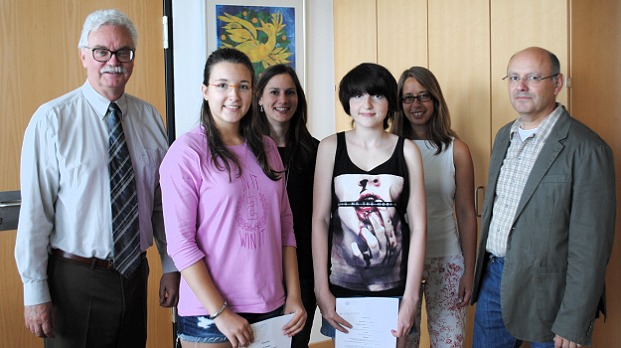 Bundeswettbewerb für Fremdsprachen Die beiden Preisträger zusammen mit ihren Lehrern Julia Naßutt, Nathalie Rapp, Bernhard Iglhaut und Schulleiter Helmut Schultz (Foto: privat)(bro) (pm) Bereits vergangene Woche nahmen die Neuntklässlerinnen Jasmin Tschida und Marie Meder ihre Landesurkunde des Einzelwettbewerbs für die Fremdsprachen Englisch und Latein entgegen.