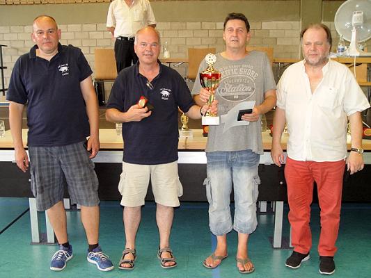 Fahrkarte zu den Deutschen Mannschaftsmeisterschaften gelöst V.l.: Jürgen Lemberger, Jürgen Waldi, Dirk Götz und Karlheinz Berger. (Foto: privat) (bro) (jl) Bei den diesjährigen Baden-Württembergischen Mannschaftsmeisterschaften im badischen Ottenheim feierte der SC Eber 82 mit 18.560 Spielpunkten nach vier Serien à 48 Spielen den Meistertitel vor den Mannschaften aus Esslingen (18.110 Spielunkte) und Hochrhein Grenzach-Wyhlen (17.961 Spielpunkte) und qualifizierte sich für die Deutschen Mannschaftsmeisterschafen in Magdeburg.