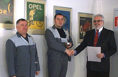 Dekra bescheinigte Marco Schwinn 100% Qualität Preisübergabe durch den Distriktleiter der Adam Opel AG, Wolfgang Bender (rechts) im Beisein von Autohaus Philipp-Geschäftsführer Ernst Wagner (links). (Foto:A.Claussen)(jc) Im Rahmen des Dekra-Werkstatt-Tests 2001 wurde im vergangenen Jahr die Autohaus Philipp GmbH getestet.