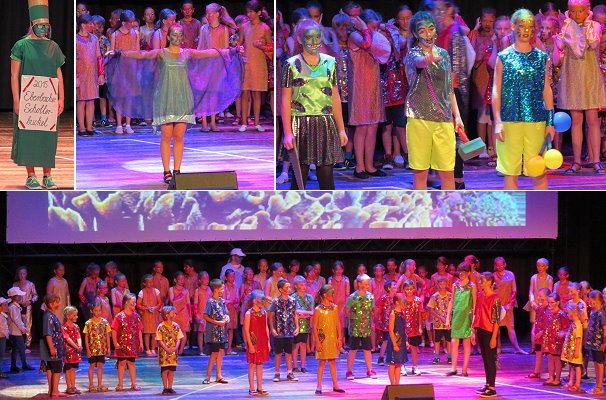 Strandleben und Unterwasserwelt in der Stadthalle (Fotos: Claudia Richter)(cr) In der Stadthalle in Eberbach präsentierten gestern 90 Kinder das Musical "Im Riff geht's rund!" von Gerhard A. Meyer und Gerhard und Ulrike Weiler. Heute Abend stehen die jungen Künstlerinnen und Künstler noch einmal auf der Bühne.