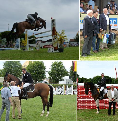 Jungblut baut Rekordserie aus - Carlo Beisswenger gewinnt Preis von Beerfelden (Fotos: privat)(bro) (rau) Der traditionelle Publikumsmagnet des Beerfeldener Pferdemarkt-Turniers ist das Mächtigkeitsspringen (SB-Springen) am Samstag. In einem spannenden vierten Stechen über eine Mauerhöhe von 2,05m blieben Ingo Jungblut (RFV Ronneburger Hügelland), Christian Kuhn (RFV Ehestetten) und Kevin Dües (ZRFV Altenberge) fehlerfrei und teilten sich den ersten Platz. Zudem baute Ingo Jungblut mit seinem Rush On seine Rekordserie auf 77 Siege in der Klasse SB aus.