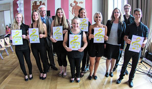 Auszeichnung für den Musik-Neigungskurs 12  Stolze Preisträger: Der Musik-Neigungskurs präsentiert seine Urkunden. (Foto: privat)(bro) (pm) Die Schülerinnen und Schüler des Neigungskurses Musik 12 unter der Leitung von Jutta Gewahl bekamen in diesem Jahr im Juni die Ehren der Werner-Stober-Stiftung in Karlsruhe als gesamter Kurs im Ensemble zuerkannt. Die Stiftung ehrt Schülerinnen und Schüler mit überdurchschnittlichen Leistungen und Engagement im Fachbereich Musik.