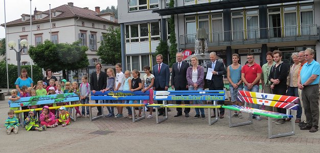 Am Montagnachmittag wurden die Parkbänke offiziell vom Vorstandsvorsitzenden der Volksbank, Ekkehard Saueressig, vom Generalbevollmächtigten Günter Apeltauer und Sabine Schietinger von der "Volksbank-Kreativabteilung" an Eberbachs Bürgermeister Peter Reichert im Beisein von vielen Künstlerinnen und Künstlern auf dem Leopoldsplatz übergeben.