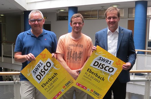 In der Stadthalle darf getanzt werden - Wir verlosen Freikarten V.l.: Tobias Soldner, Ralf Bettinghausen und Bürgermeister Peter Reichert. (Foto: Claudia Richter)(cr) Wer Spaß am Tanzen und Feiern hat aber nicht unbedingt in eine Disco gehen möchte, wird im Herbst dieses Jahres in der Stadthalle Eberbach bestens versorgt. Am 2. Oktober findet dort die SWR1 Disco statt. Die Bewirtung liegt in den Händen des SV Eberbach. Mit etwas Glück kann man schon jetzt im EBERBACH-CHANNEL Karten für die Veranstaltung gewinnen.