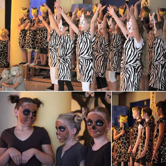 Die Kinder des Chors der zweiten bis vierten Klassen und die Theater-AG übten ein halbes Jahr lang die Lieder, Tänze und die zum Teil sehr langen Dialoge unter der Leitung von Bärbel Weber und Brigitte Gumb ein. Alles wurde mit viel Witz und gesanglichem Engagement umgesetzt. Die Viertklässler hatten traditionell die Hauptrollen. Die Erdmännchen sorgten für zahlreiche Lacher im Publikum, sie wurden sehr überzeugend gespielt von Emilie Münch/Maja Adolph als Moja, von Marie Jäger/Öykü Isik als Mbili und von Sydney Friedel/Aaliyah Demirci als Tatu. Das Giraffenjunge Raffi wurde von Aylin Hornischer/Jule Wäsch perfekt verkörpert. Bei ihrem Solo „Ach, wärt ihr bei mir“ lief wohl manchem Zuhörer eine Gänsehaut über den Rücken. Katja Giorgio/Diana Schneider identifizierten sich völlig mit ihrer Rolle als Zea, dem Zebramädchen. Für das Duett, ein heftiger Streitsong zwischen Zea und Raffi, bekamen die „ Streithähne“ kräftigen Sonderapplaus.