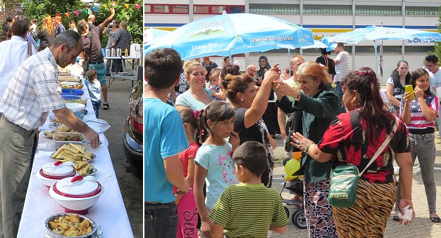 Auch für das leibliche Wohl war bestens gesorgt. Kirsten Lauer und Konrad Nerz, beide RNK-Mitarbeiter und zuständig für die Flüchtlingsarbeit in Eberbach, haben mit fast 20 Kolleginnen und Kollegen das multikulturelle Fest vorbereitet, alles für ein Grillfest organisiert, und mithilfe vieler Ehrenamtlicher aus dem AK Asyl lief alles reibungslos. Ein großes Buffet wurde von den in Eberbach lebenden Flüchtlingsfamilien reichlich bestückt. Landestypisches Essen aus über zehn Ländern wurde angeboten und war ein absolutes Highlight. Sprachbarrieren gab es am Nachmittag so gut wie keine - beim Essen und später beim gemeinsamen Tanzen verstand man sich einfach. Außerdem war die Bereitschaft groß, sein Gegenüber zu verstehen, und so fand man Mittel und Wege sich austauschen zu können.