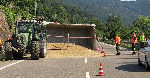 Der Fahrer eines Traktors aus Schwanheim zog um etwa 15.45 Uhr einen mit Getreide beladenen zweiachsigen Anhänger von Lindach kommend in Richtung Eberbach. Kurz vor dem Eberbacher Ortseingang platzte an dem Hänger auf gerader Strecke hinten links der Reifen. Das Gefährt geriet ins Schlingern, und der Anhänger kippte schließlich auf die Seite. Die Fracht ergoss sich über die Fahrbahn. Verletzt wurde niemand