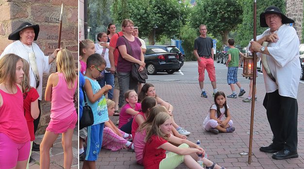 Erstaunliches über Eberbach und seine Menschen (Fotos: Claudia Richter)(cr) Im Rahmen des Ferienspaßprogramms dürfen Kinder mit ihren Großeltern abends mit dem "Nachtwächter" Eugen Emmig durch Eberbachs Gassen ziehen. Gestern waren die Teilnehmer in der Altstadt unterwegs und hörten oft Erstaunliches über die Stadt und ihre Menschen.