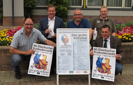 Fünf Tage Jahrmarkt in der Au  Das Organisationsteam mit Bürgermeister Peter Reichert (2.v.l.). (Foto: Claudia Richter)(cr) Fünf Tage Spaß und Unterhaltung verspricht der 80. Eberbacher Kuckucksmarkt vom 28. August bis 1. September. Über 110 Schausteller und Händler kommen auf das Festgelände in der Au.