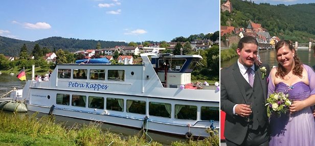 Das neue Schiff der gleichnamigen Eberbacher Familie kann für eine standesamtliche Hochzeit gechartert werden und legt dafür in Hirschhorn unterhalb der evangelischen Kirche an. Eine Verbindung zum Land muss immer gegeben sein, damit der Hirschhorner Standesbeamte – in diesem Fall war es Jürgen Broscheit - das „Hausrecht“ hat und die Trauung vornehmen kann. Auf dem Fluss hätte es nämlich der Kapitän – und das widerspräche den gesetzlichen Bestimmungen.