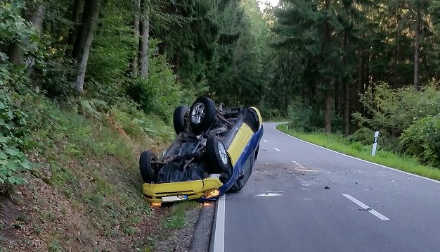 Pkw landete auf dem Dach (Foto: Crispian Tonn)(hr) Recht glimpflich verlief für eine junge Autofahrerin ein Unfall heute Vormittag auf der L 590 zwischen Schwanheim und Eberbach.