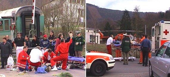 Fußgänger an Bahnübergang von Zug erfasst - tödliche Verletzungen (Fotos:Richter)(hr) Trotz geschlossener Schranke wollte heute gegen 14.30 Uhr ein Fußgänger den Bahnübergang an der Berliner Straße - Einmündung Quellenweg überqueren. Der Zugführer eines Nahverkehrszugs aus Richtung Erbach sah den Mann noch auf den Schienen stehen und gab Signal. Der 75-Jährige tat zwar noch einen Schritt zur Seite, wurde aber von der Lokomotive erfasst und auf die Straße geschleudert. Zum Transport des lebensgefährlich Verletzten wurde ein Rettungshubschrauber angefordert, der beim Einkaufszentrum Eberbach-Nord landete und den Mann nach notärztlicher Erstversorgung in die Chirurgische Klinik nach Heidelberg brachte, wo er später seinen Verletzungen erlag.