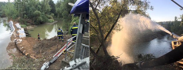 Elf Helfer fuhren in den frühen Morgenstunden nach Jagsthausen ans alte Klärwerk. Dort angekommen, wurde direkt die Börger-Großpumpe platziert, um pro Minute 5.000 Liter Frischwasser in einen abgesperrten Flussbereich zu pumpen. In diesem Altarm wurden in den vergangenen Tagen immer wieder Fische durch den dortigen Fischerverein eingesetzt. Mittels Schlauchboote der DLRG kontrolliert die Mannschaft den stromabwärts liegenden Damm, da dieser Bereich zu Fuß nicht erreichbar ist. Nachdem bekanntgegeben wurde, dass die Giftblase im Laufe des Sonntags an der Einsatzstelle ankommen sollte, wurde die Großpumpe umgebaut und lief von Samstagabend 20 Uhr im 24 Stunden-Umwälzbetrieb. Dabei wird Wasser aus der Jagst entnommen und in die Luft gespritzt. Dadurch wird das Wasser mit Sauerstoff angereichert und der Jagst wieder hinzugefügt. In dem abgeschirmten Becken wird inzwischen Pressluft ins Wasser gepumpt, damit die Fische genügend Sauerstoff haben, um in dem nun stehenden Gewässer zu überleben. Mittels Wilo Elektrotauchpumpen befördert der OV Eberbach über eine Distanz von 300 Metern das frisch angereicherte Wasser in den hinteren Bereich des Beckens. Da die Giftblase mit einer Verspätung von 20 Stunden erst durch Jagsthausen fließen wird, wurde der Betrieb der Börger Pumpe am Sonntagabend um 22 Uhr eingestellt. Am Montagmorgen wurde diese dann umgebaut. Nun wird mit dem Venturi Prinzip das Wasser im Schlauchtrakt bereits mit Sauerstoff angereicht und kann so mit einem größeren Sauerstoffgehalt dem Wasser wieder hinzugegeben werden.