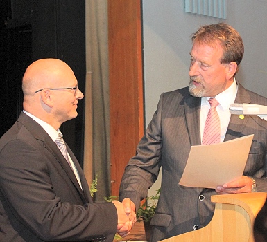 Verabschiedung und Verpflichtung bilden eine Einheit Der noch amtierende Landrat des Odenwaldkreises Dietrich Kübler hält die Ernennungsurkunde für seinen Nachfolger Frank Matiaske bereit. In öffentlicher Sitzung des Kreistages erfolgten am 31. August in der Werner-Borchers-Halle in Erbach die Verabschiedung von Kübler sowie die Einführung und Verpflichtung von Matiaske, der am 1. September seine Arbeit an der Spitze der Kreisverwaltung aufnahm. (Foto: Odenwaldkreis)(bro) (owk/bw) Im Mittelpunkt der 26. Sitzung des Kreistages des Odenwaldkreises in der laufenden Legislaturperiode standen am 31. August die Verabschiedung des seitherigen Landrates Dietrich Kübler sowie die Einführung und Verpflichtung seines Nachfolgers Frank Matiaske für die Amtszeit von sechs Jahren beginnend mit dem 1. September. In der Werner-Borchers-Halle in der Kreisstadt Erbach erlebten mehr als 400 Gäste die öffentliche Abend-Tagung der Mandatsträger in feierlichem Rahmen, unter ihnen die Präsidentin des Regierungspräsidiums Darmstadt Brigitte Lindscheid sowie die Direktoren des Hessischen Landkreistages Christian Engelhardt und Dr. Jan Hilligardt.