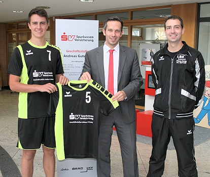 Neuer Trikotsatz für die Jugendmannschaft - Neue Spieler willkommen V. l.: Giulio Broghammer, Andreas Gutwein und Daniel Müller. (Foto: privat)(bro) (dm) Pünktlich zur Saisonvorbereitung des Indiaca-Teams konnte die Jugendmannschaft mit Unterstützung der Sparkassen-Versicherung einen neuen Trikotsatz erhalten. SV-Geschäftsstellenleiter Andreas Gutwein überreichte gestern das neue Trikot symbolisch an Mannschaftskapitän Giulio Broghammer und Trainer Daniel Müller. Somit präsentiert sich der TVE künftig entsprechend der ambitionierten Ziele in einem professionellen Outfit.