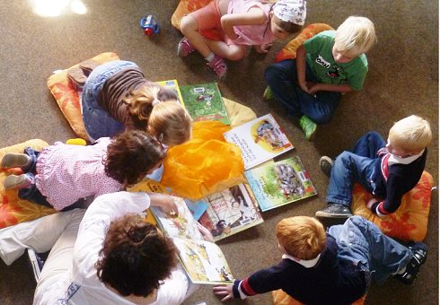 Zur Begrüßung wurde das Büchereilied gesungen und das Büchereimaskottchen Fridolin vorgestellt – jeder durfte ihn mal halten. Claudia Röderer las den Kindern das Buch „Lieselotte sucht“ von Alexander Steffensmeier vor: Begeistert lauschten die Kinder der Geschichte und betrachteten interessiert, was die Postkuh Lieselotte mit dem Postboten alles unternimmt, um ein vermeintlich verlorengegangenes Paket wiederzufinden. Die sehr detailliert und einfallsreich gezeichneten Bilder luden immer wieder dazu ein, das Vorlesen zu unterbrechen. Zu lustig war doch anzusehen, was dort so alles passiert. Das Spiel „Lieselotte lauert“ wurde gespielt, bevor noch weitere Bücher vorgelesen wurden.