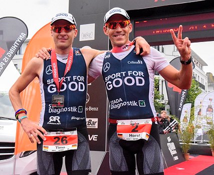 Die 1,9 Kilometer lange Schwimmstrecke in der Ostsee machte es den Athleten besonders schwer. Timo Bracht fand sich beim Wechsel auf die Radstrecke in einer Verfolgergruppe auf Platz sieben wieder. Der achtfache Ironmansieger lieferte auf dem Rad eine starke Leistung ab und kam als Fünfter in die Wechselzone. Nach einem ebenfalls sehr schnellen Wechsel konnte er bereits auf den ersten beiden Kilometern weitere Plätze gutmachen und nahm als Drittplatzierter mit 40 Sekunden Rückstand auf seinen Teamkollegen die verbleibenden 19 Laufkilometer in Angriff. Auf dem Halbmarathon durch die Binzer Innenstadt und entlang des Schmachtner Sees hielten die beiden "TEAM SPORT FOR GOOD" Athleten souverän ihre Positionen und beendeten das Rennen mit den beiden schnellsten Halbmarathonzeiten auf den Plätzen zwei und drei in 3:54:55 und 3:56:07.
