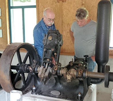 Ähnlich einer Dampfmaschine drücke das Wasser auf die Kolben der zweizylindrigen Maschinen. „Die Kolbenstangen übertragen die Bewegung und die Kraft auf die Kurbelwelle.“ Auf der einen Seite der Kurbelwelle sitze das Schwungrad, auf der anderen Seite die Kupplung, die Motor und Pumpe miteinander verbinde. Beachtenswert sei die Steuerung der Wassermotoren durch die unterhalb der Zylinder angeordneten Schieber.