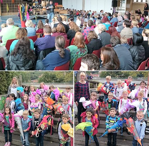 Bürgermeister Rainer Sens wünschte den Erstklässlern, „viel zu lernen, zu entdecken, zu erreichen“. Die Einschulung sei im Gegensatz zu anderen Dingen ein absolut einmaliges Ereignis im Leben. „Genießt den Tag“, rief er den Kindern zu. Nach dem Lied der Viertklässler, die gleichzeitig Paten für die „Anfänger“ sind, wurden die Kinder ihren beiden Klassenlehrerinnen zugeteilt, die ihnen die Zimmer zeigten. Später stand dann noch ein gemeinsames Klassenbild auf dem Schulhof mit der dekorativen Schultüte an.