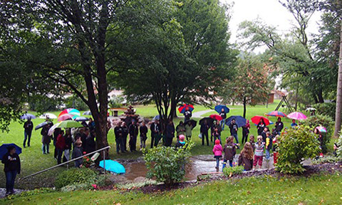 Waldbrunner Ortsteil gewinnt Silbermedaille im Dorfwettbewerb Trotz strömenden Regens waren über 50 Mülbener mit der Landeskommission unterwegs. (Foto: Hofherr)(hof) Nachdem die Landeskommission im Rahmen des Dorfwettbewerbs „Unser Dorf hat Zukunft“ Mülben eine Silbermedaille zuerkannt hat, gratulierte Waldbrunns Bürgermeister Markus Haas nicht nur dem Sieger Hirschlanden in der Gemeinde Rosenberg, sondern ganz besonders der Dorfgemeinschaft Mülbens um Ortsvorsteher Timo Bachert und Stellvertreter Steffen Edelmann, die es mit außergewöhnlichem Engagement geschafft habe, eine zukunftsfähige Entwicklung der dörflichen Heimat anzugehen und überzeugend zu leben. Davon hatte sich am Mittwoch die Landeskommission unter Leitung von Dr. Konrad Rühl selbst überzeugt.