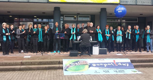 Aus diesen Gründen sang der Chor anschließend den Song „We are changing the world“, den er vorab auf Deutsch übersetzte und der am diesjährigen Gospelday von über 10.000 Menschen an den unterschiedlichsten Orten zur gleichen Uhrzeit gesungen wurde. Nach weiteren Songs beendeten die 31 Sängerinnen und Sänger ihr kleines Konzert mit dem Gospel „Oh Happy Day“. Der Chor wurde während der Aktion von seiner Solistin Karin Raule und von Chorleiter Carsten Best am Piano unterstützt.