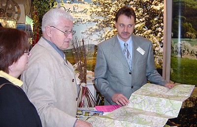 Ferienregion Odenwald als Marke positioniert Der Odenwald präsentierte sich erfolgreich mit einem gemeinsamen Auftritt auf der diesjährigen Reise- und Campingmesse in Essen. Vorrangig war die Region gefragt, aber auch gezielte Auskünfte musste das Standpersonal, hier Klaus Johe von der Tourist-Information Beerfelder Land im Gespräch mit Wanderinteressenten, beantworten. (Foto:TIBL)(jc) Dass der Odenwald zu einer immer bedeutenderen touristischen Mittelgebirgslandschaft heranreift, konnte man wieder eindrucksvoll auf der größten Reisemesse in Nordrhein-Westfahlen feststellen. Der Nachfrage nach kulturellen Sehenswürdigkeiten, Rad- und Wanderpauschalen sowie den Freizeitangeboten der Ferienregion bis hin zu konkreten Gruppenarrangements konnte ausreichend Rechnung getragen werden.